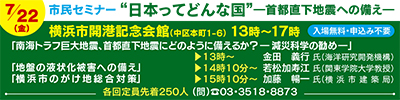 崖地が多く分布し、土砂崩れなどの災害と常に隣り合わせにある横浜市。そんな市内の災害リスクと、被害を最小限にするための対策を紹介する「市民セミナー”日本ってどんな国”―首都直下地震への備え―」が7月22日、横浜市開港記念会館で初めて開かれる。