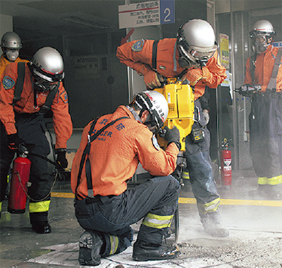 22日の訓練は、最初に3階にある鉄製の扉をエンジンカッターで切断。数回に分けて刃を入れ、扉に三角形の穴を開けた。消防団員が行う際は、刃が扉に入っていかず、エンジンカッターの操作に苦戦する場面もあったが、慣れるとスムーズに刃を動かしていた。次に2階のコンクリートの床面に穴を開け、そこから1階に行く訓練があった。2人1組で削岩機を床に当て、少しずつ穴を開けた。