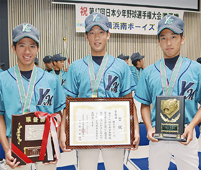 大阪府で行われた中学生硬式野球全国大会で準優勝した「横浜南ボーイズ」が8月29日、南区役所を表敬訪問し、大木節裕区長らに準Vを報告した。