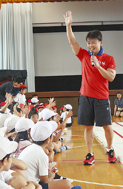 田中さんは、約430人の全校児童を前にダンスを織り交ぜた準備体操を披露。素早くユニークな動きで児童と教諭を沸かせた。また、高校生の時に父親を亡くした経験や度重なるけがに悩まされた選手時代のエピソードを話し、「辛いことがあっても頑張ってこられたのはある先生から『諦めない』という言葉をもらったから。みんなも強い心を持ってほしい」と伝えた。