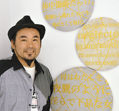 渡辺さんが公開する作品は、人の「心の傷」を書き写した直径50cmほどのコンクリートの板。渡辺さんは4月から自身のホームページに「あなたの傷を教えてください」と明記して匿名での投稿を募集。性的虐待を受けた経験や流産した女性の言葉など、寄せられた投稿文を金色の絵の具で板に書き記し、ハンマーで割って接着剤で修復した。陶芸の伝統技法として知られるこの「金継ぎ」と呼ばれる作業を行うことで、昇華されて、いずれは輝いていく「心の傷」を表現した。