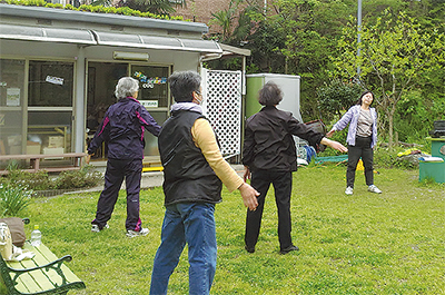 活動後は「ティータイム」を設けて参加者が歓談。年に2回は懇親会も実施する。メンバーの平均年齢は60歳超。緑豊かな広場で毎週、ラジオ体操も行っており、良い空気を吸いながら心身の健康につなげている。きれいに整った広場は町内会で行う行事の中心地だ。