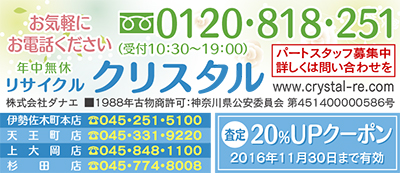 市内に4店舗を構えるリサイクルショップ「クリスタル」は、電話1本で女性スタッフが無料出張買取。20年の信頼と実績があり「安心で便利」との声も多い。