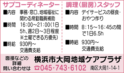 地下鉄弘明寺駅徒歩5分。高齢者や子育て世代をサポートして地域福祉を担う大岡地域ケアプラザが事務、窓口対応などを行う「サブコーディネーター」と調理スタッフを募集している。