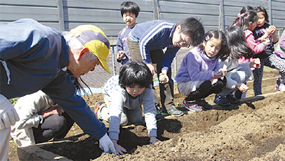 同校には開校時から20平方メートルほどの校内畑があり、野菜を育てるなどして児童の食育につなげてきた。近年は畑の手入れが行き届かないこともあったが、農業経験者を含めた地元住民が「農援隊」を結成し、畑を手入れ。給食の食べ残しを肥料に活用するなど、児童は「食のサイクル」を学びながらジャガイモやダイコンなどを育て、農作業を通じた積極的な地域交流が進められている。
