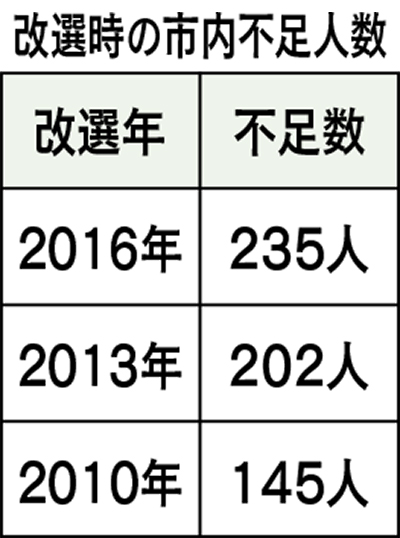 3年に1度の全国一斉改選を12月1日に控え、横浜市内では定数4156に対して235人の不足見込みとなる。前回の一斉改選では、定数4118に対して202人が、10年では4029に対して145人が不足していた。人口増加に比例して定数が増えている現状はあるが、改選を重ねるごとに欠員が増えている。