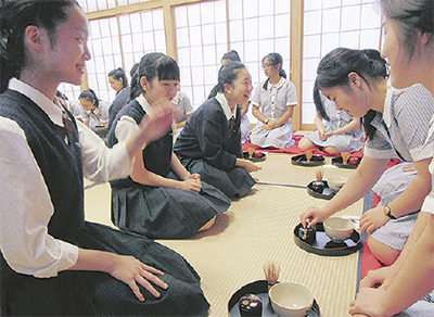 同部は茶道を通した日本伝統の「おもてなし」「思いやりの心」を学び、発信する。以前は茶道流派「庸軒流」を学んでいたが、顧問の細田孝充教諭が就任した2014年度から現在の流派「裏千家」に変わった。