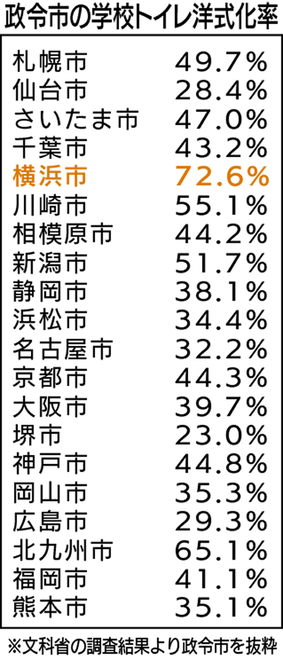 横浜市の小中学校の洋式化率は72・6%で全国平均を29・3ポイント上回った。全国に20ある政令市と比較すると、2位の北九州市よりも7・5ポイント高く、政令市の中で最も低い23・0%の堺市とは3倍以上の差が開いた。