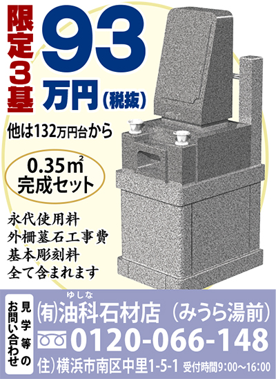 みうら湯前の(有)油科石材店では、500年以上の歴史を持つ由緒ある寺、西光寺霊苑(南区中里3の25の3、地下鉄・京急弘明寺駅から徒歩12分、駐車場完備)の永代使用料、墓石、外柵工事代などを含んだ0・35平方メートルの「完成セット墓地」を、先着3人に93万円の特別価格で販売中(通常は99万円)。また、今回墓地を購入した場合は年間3回の無料墓石洗浄が永年に渡って行われる。
