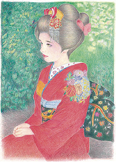 原さんは、茶色い髪と白いドレスが特徴の外国人少女が描かれたルノワール編「イレーヌ・カーン・ダンヴェール嬢」の原画をもとに、少女の輪郭を紙に写して原画とは異なる着物を描いた。着物は主に赤色で着色。髪は日本人女性のように束ねた結い髪を描き、黒髪に。原画の洋装とは一変、美しい和装の女性へと変化させた。