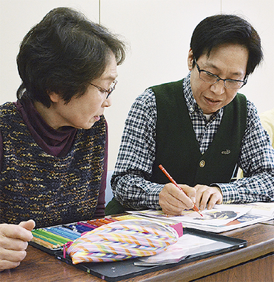 原さんは約8年前、書店にあった「大人の塗り絵」を購入して自己流で技術を高めた。2010年のコンテストで自身の作品が入選。その後は都内で行われた専門教室に通って腕を磨き、14年にインストラクター資格を取得。同年、ボランティアサークル「大人の塗り絵クラブ」の活動を大岡地区センターでスタートさせた。現在は別所コミュニティハウス、南センターなどで約70人を指導する。