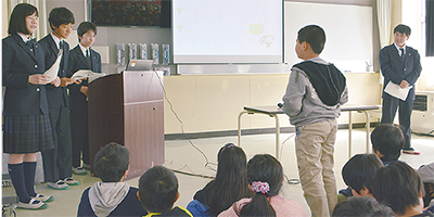 横浜国立大学教育人間科学部附属横浜中学校1年生(当時)の生徒5人が3月22日、井土ヶ谷小学校で5年生を対象にした「サイバー犯罪防止教室」を行った。