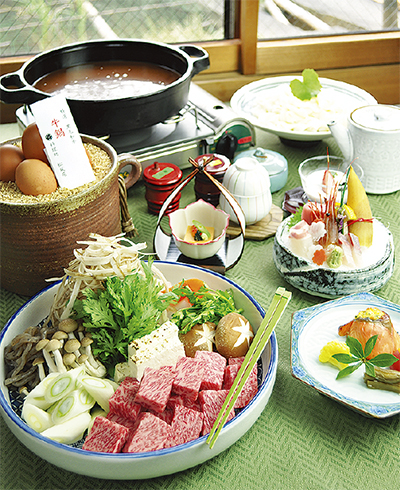 黒毛和牛を使った鍋は4種類の味噌と数種類のおろし野菜を練り合わせた特製味噌味。季節の野菜、刺身、茶碗蒸し、焼物に羽二重うどん、デザートが付き1人前9180円(2人以上、要予約)。牛鍋のみ(6264円、2人以上)もあり。