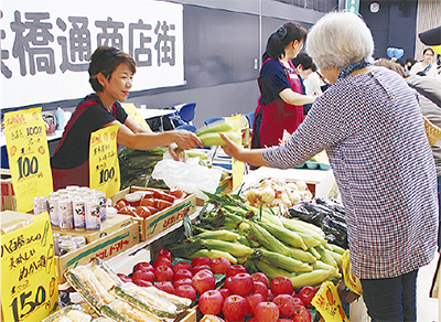 南区内の商店街が自慢の品が販売する「商店街朝市」が6月10日に南区役所で行われた。