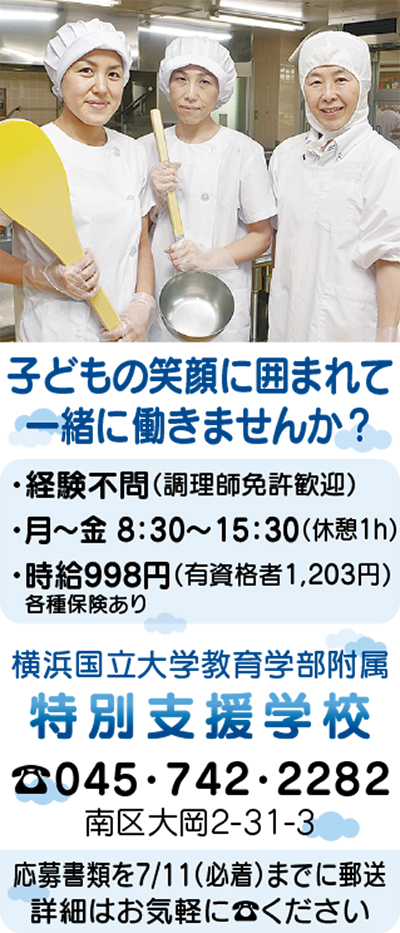 地下鉄弘明寺駅徒歩5分の横浜国大附属特別支援学校が給食調理員を募集している。現在30代〜50代スタッフが活躍。調理、片付け、清掃等が主な業務。料理や子ども好きな人なら資格・経験は問わない。給食作りで子どもの食育に携わり、やりがいを感じられる仕事。