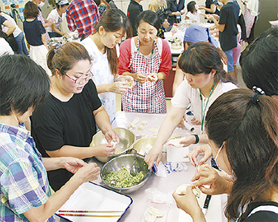 保護者と児童合わせて約100人が参加。中国人保護者が中心となり、水餃子の作り方を指導。皮から作る本格的なもので、具はキャベツ、ニラ、エビ。具を包んだ皮は縁を小さく折り畳むようにした。日本人の保護者は「この包み方は初めて見た。覚えて帰りたい」と話した。参加者は茹でられた約1千個の水餃子を味わいながら、料理などの話で盛り上がった。