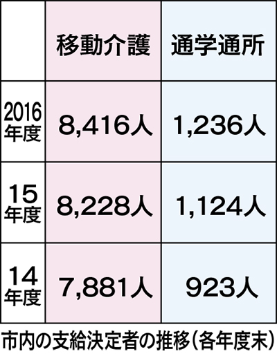 市健康福祉局によると、16年度末の市内支給決定者は計9652人で14年から848人増。一方、現在のサービス従事者は1万人以下と見られ、担当者は「支援対象者の2倍はいないと(対応が)追いつかないという現場の声もある」と話し、利用者の需要に供給が追い付いていないという。
