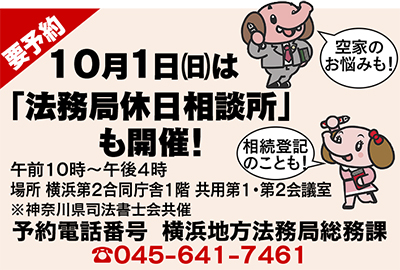 県内の司法書士と司法書士法人が所属する「神奈川県司法書士会」(星野務会長)は10月1日の法の日を記念して県内各地で「無料法律相談会」を開催する。同会の司法書士が相続や遺言、成年後見、労働トラブル、借金、会社や土地・家屋の問題など業務範囲内の様々な悩みに応じてくれる。詳細は神奈川県司法書士会へ。