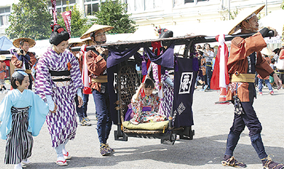 江戸時代の荷役制度「助郷(すけごう)」を再現した行列が10月8日、永田小学校で行われた「北永田ふるさとふれあいまつり」の中で披露され、約100人が歩いた。