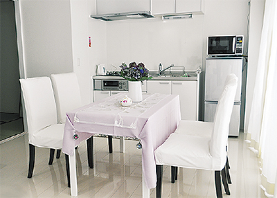 3階建てで、白をメインにした内装が特徴。式場は約30人入れるゆとりの広さ。親族が泊まれるよう、バスルームや和室も完備。テーブルや電子レンジ、冷蔵庫もあり、普段の生活と同じように安心して過ごすことができる。
