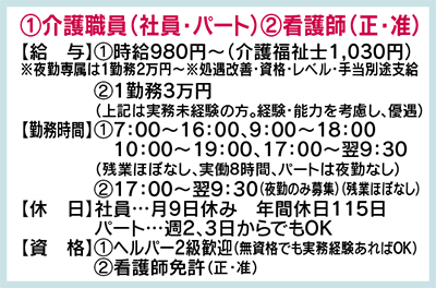 50以上の医療機関や介護施設を運営しているグループの研修制度があるので、ブランクがある人でも幅広い介護スキルを身に付けられる。長く安心して働ける職場を目指し、残業ゼロや希望を反映したシフト作成を意識している。相模一郎施設長は「ブランクがある方や週2〜3日だけの方もOKです。良い施設を作りましょう」と話す。
