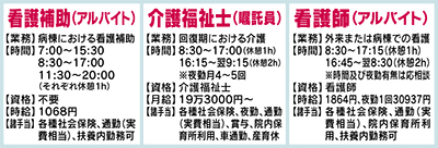 回復期のリハビリなどを手伝う介護福祉士(嘱託員)、外来や病棟での看護を行う看護師(アルバイト)も同時募集。夜間対応の保育所も利用でき、子育て中の”ママさん”も安心。現在は20代〜60代まで幅広い年齢層が活躍する。