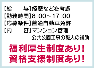 学歴は不問。庭の手入れや緑地のメンテナンス業務の補助が主な仕事なので、資格は普通自動車免許があればOK。造園技能士や造園施工管理技士、土木施工管理士、CAD技能者、測量技能者、建設機械などの資格優遇あり。給与は経歴などを考慮。車通勤可。単身用、世帯用の社員寮も完備される。