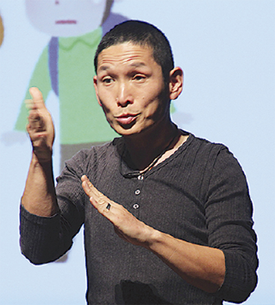 映像作家で聴覚障害者の早瀬憲太郎さんが講演。手話を使い、それを読み取った人がマイクで伝える形で進んだ。