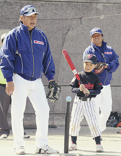 プロ野球の日本ハムなどで投手として活躍した西崎幸広さんとロッテの捕手だった里崎智也さんが3月3日、清水ヶ丘公園で行われた小学生対象の野球教室で講師を務めた。