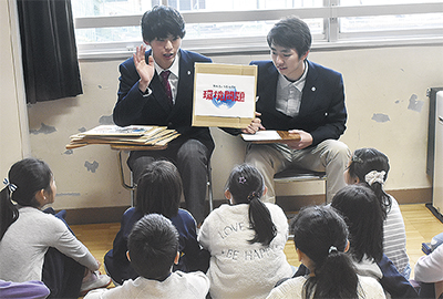 テーマは▽動物▽地球の環境問題▽植物性油脂について――の3つ。授業はグループに分かれて進み、手作りのパネルや写真など小学生にも分かりやすいように説明。地球温暖化が起こる原因や気を付けること、動物が温暖化や森林伐採によって絶滅してしまうことなどを説明した。その上で「電気をこまめに消すことやごみを分別すること、食べ物を残さず食べることが大切」と話した。