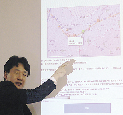 3月16日には、認知症の人が徘徊し、行方不明になったことを想定した模擬訓練を実施。タグを持った認知症役の男性が六ツ川一丁目コミュニティハウスからマルエツ六ツ川店方向を歩き、道沿いの4カ所にアプリを入れた人が立ち、実際にどのように情報が送られるかを確かめた。確認画面では、男性が数分ごとに移動する様子が地図上のポイントで分かり、マルエツ付近で見つけることができた。