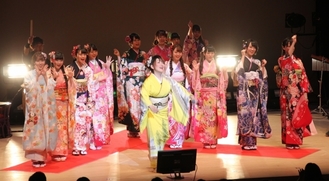 松本さんは1月8日にあった横浜市の成人式にゲスト出演していたこともあり、はれのひの被害を知り、「悲しくて、悔しくて、いてもたってもいられなかった」と歌で被害者を元気付けようと、コンサートの開催を決意。被害者を無料招待したほか、20歳以下の若者も抽選で無料招待。約500人が集まりました。「ピカチュウカラー」の黄色い着物に身を包んだ松本さんは「横浜でライブをする機会がなく、地元でできて嬉しい」と話しました。コンサートにはアイドルグループ「=LOVE」も出演。12人が振り袖姿で松本さんと共演しました=写真=。