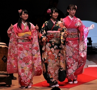4月1日にみなみん(南公会堂)で行われた松本梨香さんのコンサート。松本さんが演技指導するアイドルグループ「=LOVE」のメンバー12人も鮮やかな振り袖姿で出演しました。メンバーの1人、瀧脇笙古(しょうこ)さん=写真左=は横浜市出身。自身のツイッターで大通公園にある「歌丸桜」を紹介するなど「横浜愛」を感じさせてくれます。瀧脇さんは4月から高校2年生だそうで、これからの活躍が楽しみですね。