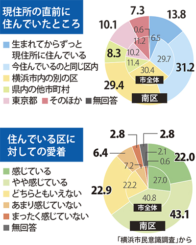 定住意識に関し、現住所の直前に住んでいた場所が聞かれ、南区回答者の13・8%が「生まれてからずっと現住所に住んでいる」と答え、市内で最も高い割合だった。「今と同じ区内」と合わせ、45%が今も直前も南区に住んでいることが分かった。この割合は、市全体では36%で、南区民が長い間、区内に住み続けていることが鮮明になった。