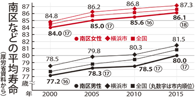南区の男性平均寿命は80歳、女性は86歳――。厚生労働省が4月17日に2015年の市区町村別の平均寿命を公表した。男性では青葉区が83・3歳で全国トップとなった一方、南区は男女とも全国平均を下回った。特に女性は市内18区で最下位。この傾向は以前から続いており、南区役所は区民の健康づくりに力を入れる。
