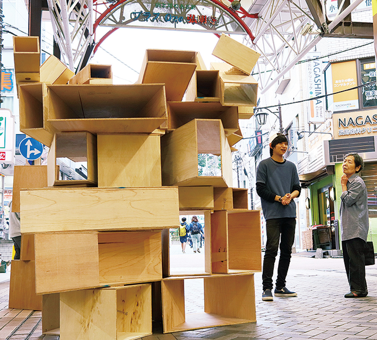 あるグループは商店街に掲げられた旗や標識など、普段は見過ごしてしまうような風景を木で作った箱を積み上げた物からのぞいてもらう作品を商店街内に置いた。神大の金井賢三さんは「今までとは違う商店街の様子を感じてほしかった。商店街を歩く人が足早に通り過ぎているように見えたので、この作品によって立ち止まったり、ゆっくり歩いてほしかった」と意図を語る。別のグループは、商店街の周辺にたばこの吸い殻が多く捨てられている場所があることに着目し、木を交差させ、そこに吸い殻入れなどを置く作品を飾った。