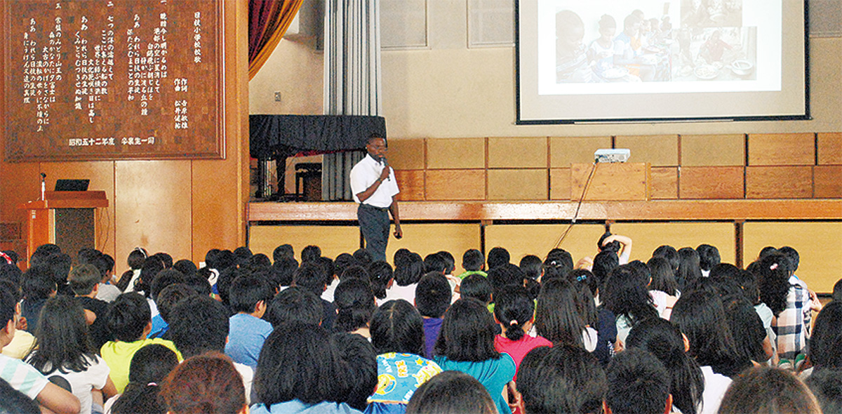 プログラムは市資源循環局が策定したもの。プログラム初日となった4日には、国連食糧農業機関(FAO)駐日連絡事務所のンブリ・チャールズ・ボリコ所長が来校。5、6年生に講話した。ボリコ所長は「世界には栄養不足に苦しむ人が8億1500万人もいるにもかかわらず、人が食べるために作られた物の3分の1は捨てられている」と実情を紹介。その上で、「何ができるか家族や友達と話し合うことが大切だ」と話した。講話後、ボリコ所長は総合学習の時間で食品ロスについて学んでいる5年3組の児童と一緒に給食を食べて交流した。