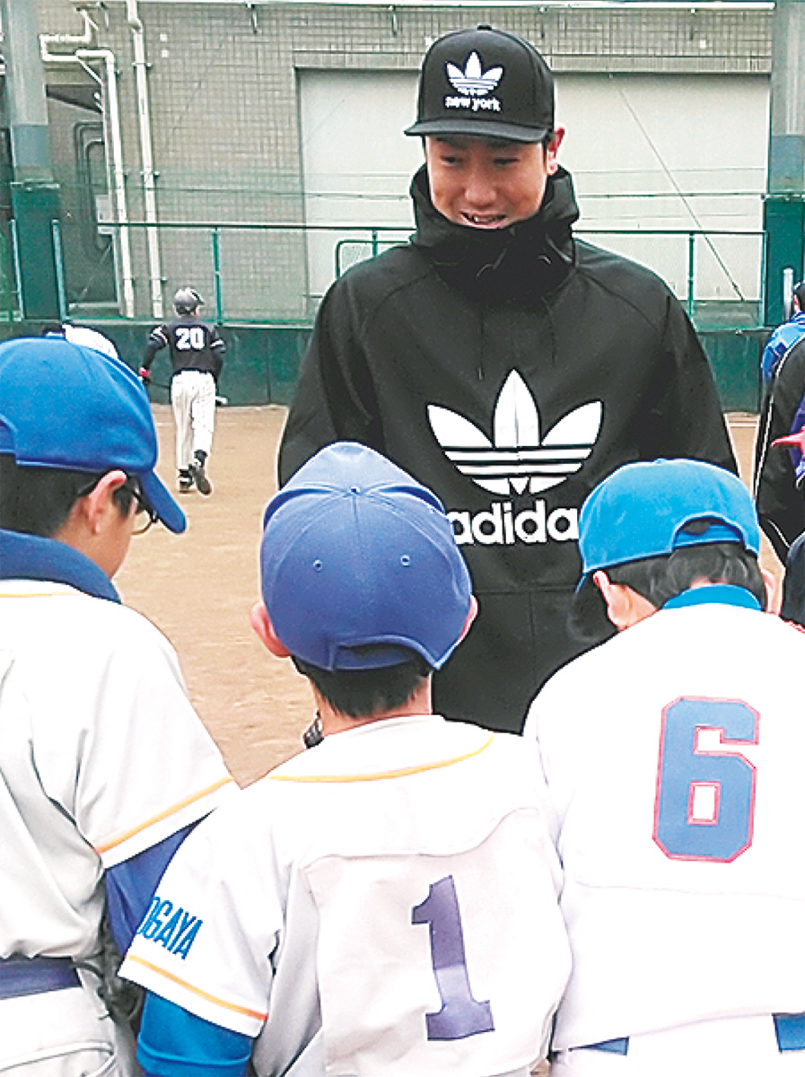小学生の投球フォームを見た山口さんは自分の投げ方を見せながら選手にアドバイスを送った。久々の母校のグラウンドに「楽しかった」と語った。