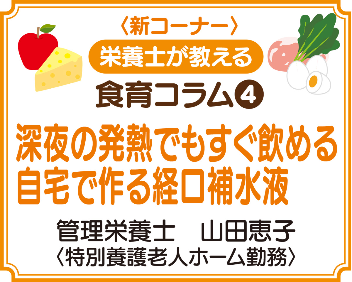 では、家庭でもできる経口補水液の作り方をご紹介します。1リットルの湯冷ましに3g(小さじ2分の1杯)の食塩と40g(大さじ4杯)の砂糖を溶かしレモンやオレンジのしぼり汁を入れる。湯冷ましを無塩のトマトジュースで変えて作ると、カリウム補給にもなります。