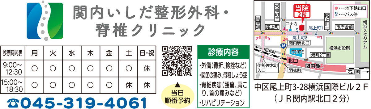 JR・地下鉄「関内駅」すぐ、桜通り入口のビル2階に「関内いしだ整形外科・脊椎クリニック」が5月13日、開院した。