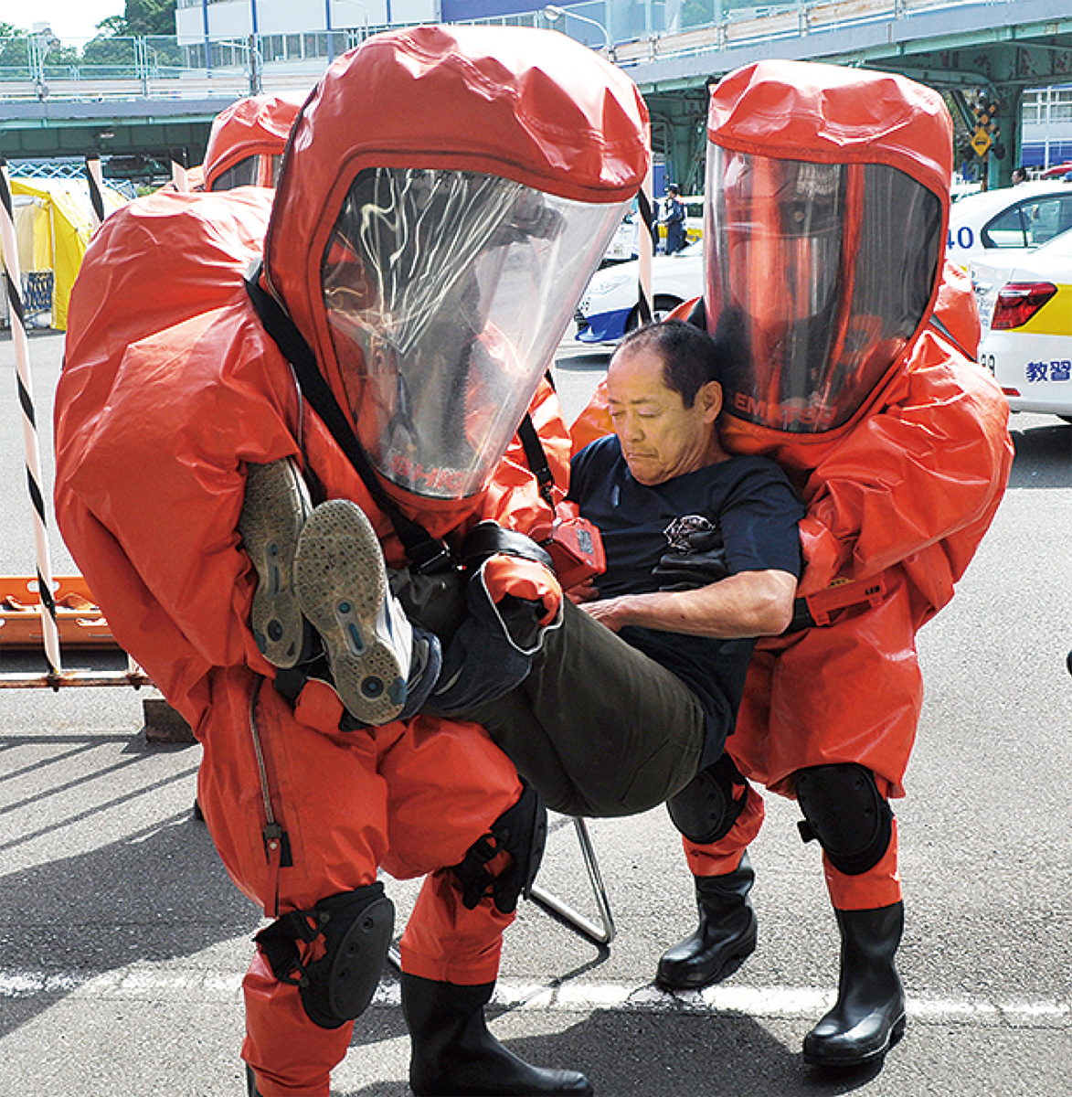 不特定多数の人が出入りする施設で、犯人がペットボトルに入った薬品を散布し、負傷者が発生した場面を想定。犯人確保、負傷者の救護、病院への搬送まで、参加機関が連携して訓練した。