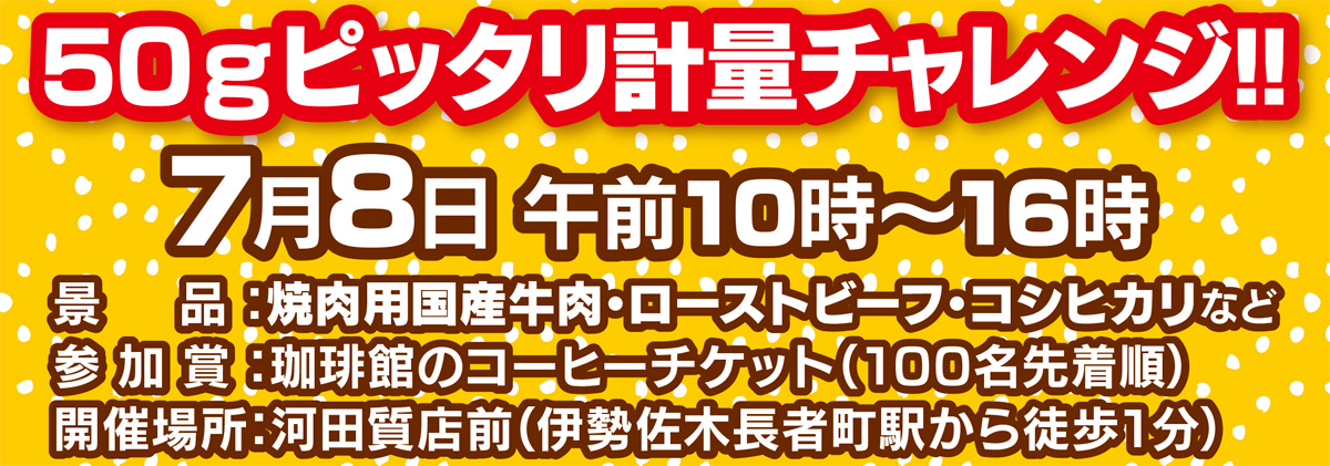 このイベントは、かごに入った「アメちゃん」を計量器に乗せて50gピッタリを目指すもの。ジャスト50gの「ピタリ賞」のほか、計量の誤差によって賞が決まる。焼肉用国産牛肉やローストビーフ、コシヒカリなど豪華景品を多数用意している。