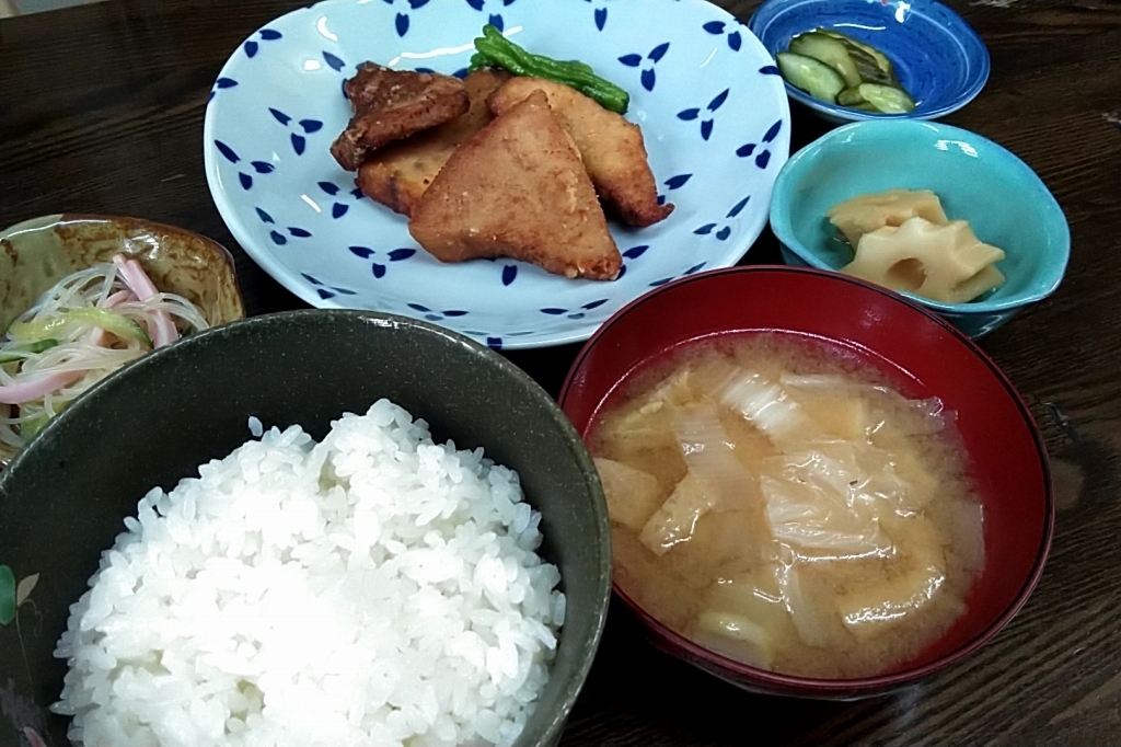 南区役所向かいの名物店。ランチ時には区役所職員も多数。おでんも有名です。この日のランチはマグロの竜田揚げにちくわぶなどが付いて700円。