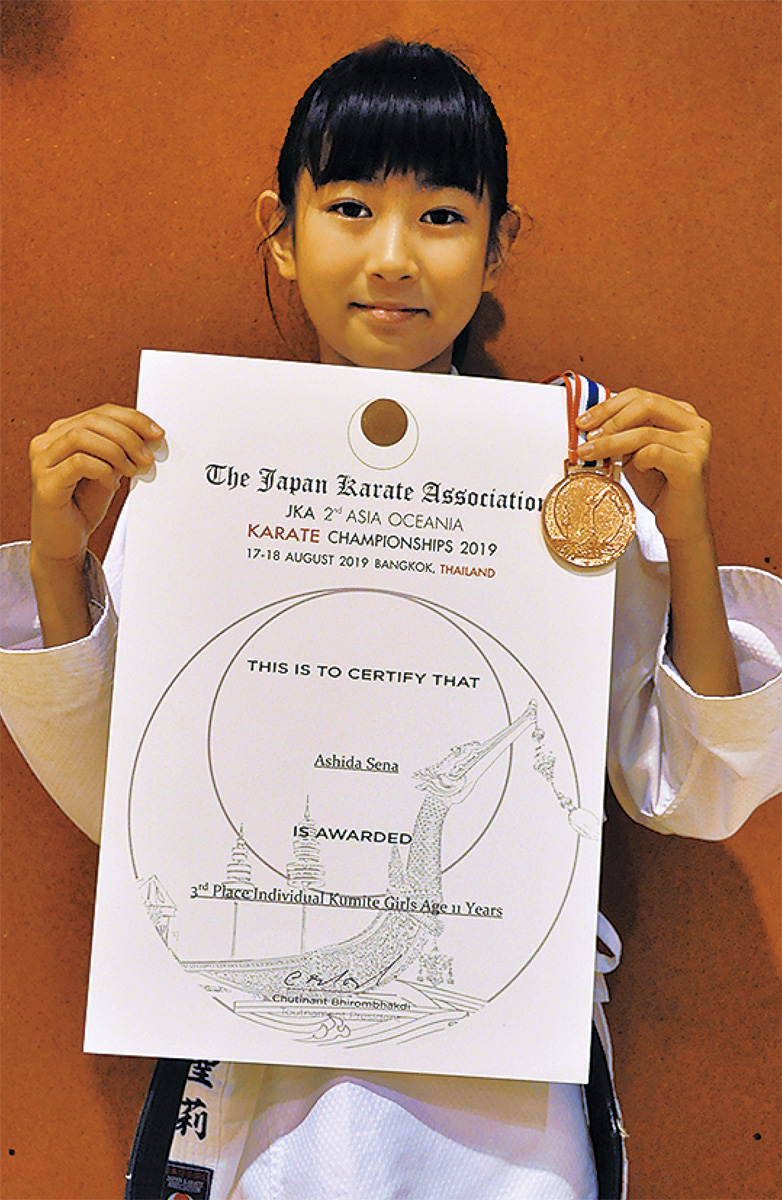 市立六つ川小学校5年生の芦田聖莉さんが8月17日、18日に、タイで行われた「第2回アジア・オセアニア空手道世界選手権大会」に出場し、個人組手・11歳女子の部で銅メダルを獲得した。