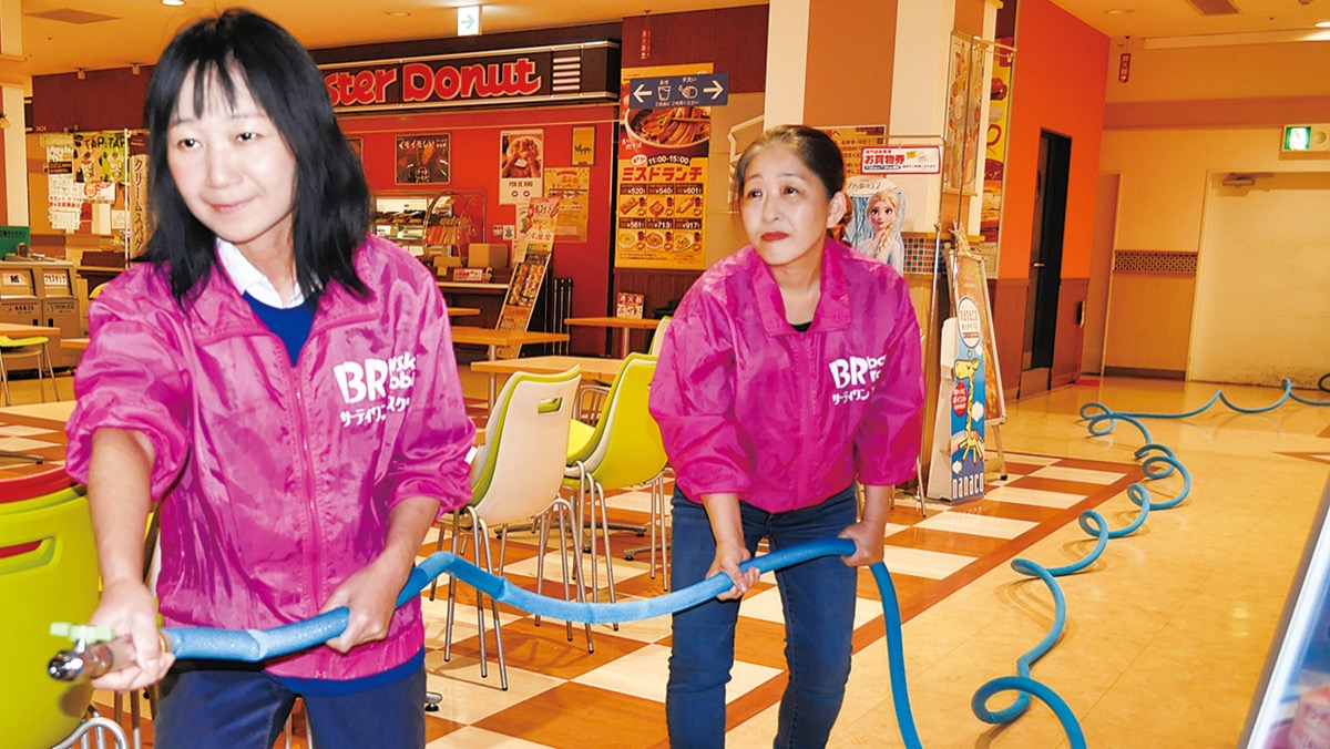 1階のフードコートで火災が発生し、スタッフが防火センターに連絡するところから訓練が開始。スタッフは署員の指導の下、消火器や消火用散水栓を使った初期消火訓練を行った。