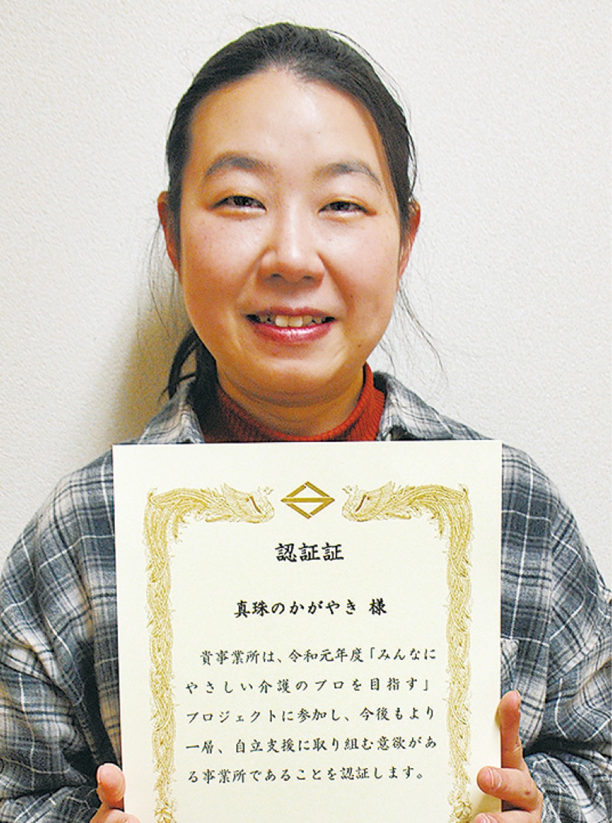 大岡5丁目の小規模多機能型居宅介護事業所「真珠のかがやき」がこのほど、横浜市の「みんなにやさしい介護のプロを目指す」プロジェクトに認証された。一日6回利用者宅を訪問するなど、自立支援を促す介護が評価された。