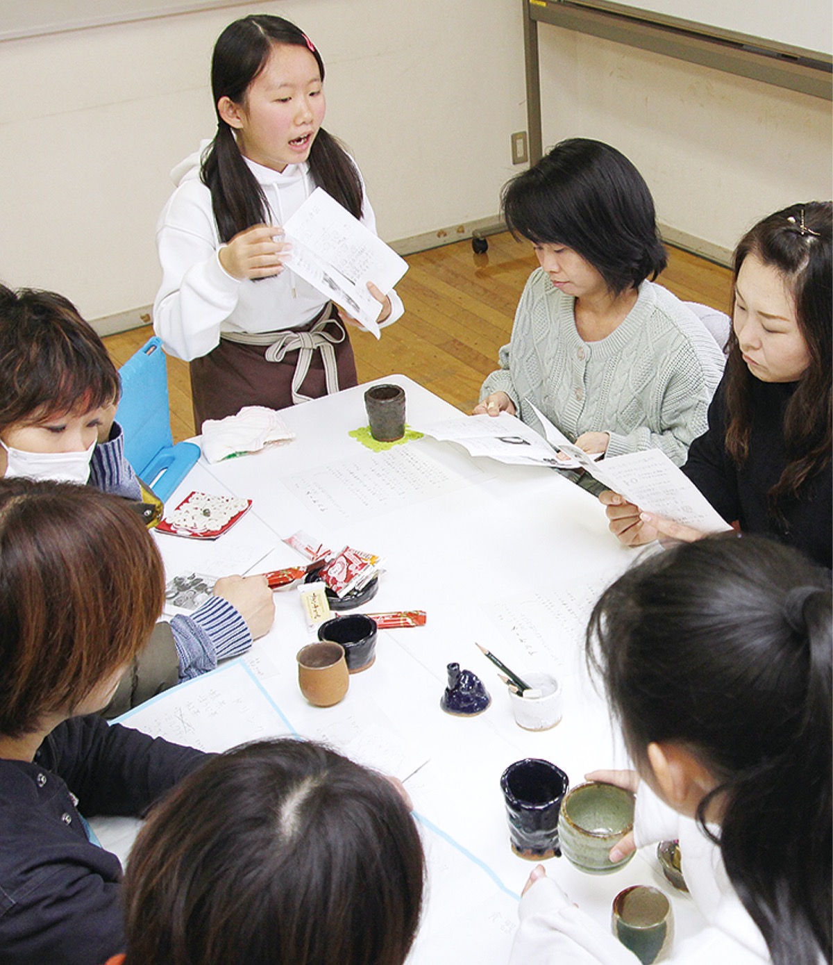 助言を生かし、児童はコップや箸置きなどを制作した。「大岡焼」と名付け、学んだことを保護者や学校周辺の住民に披露するため、「焼きものカフェ」を地区センターで開催。来場者へ大岡焼に入れた茶やコーヒーを振る舞いながら、自分たちが調べた焼き物に適した土の特徴や眞葛焼と大正期に永田で活動していた陶芸家・井上良斎について説明。さらに、不要になった食器を粉砕して新たな食器を作る「Re-食器」を紹介し、限られた資源を有効に使う大切さも訴えた。