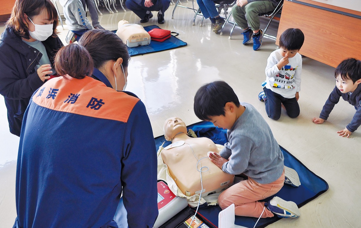 南消防署蒔田消防出張所の署員が消火器やAEDの使用方法を説明。AEDの使用体験では、胸骨圧迫といった救急蘇生法も学んだ。