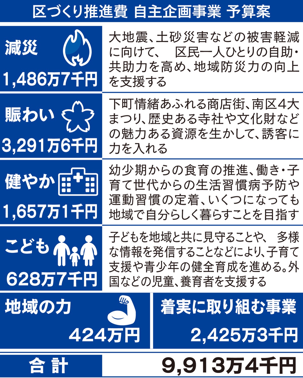 15年度以降と同様に「減災」「賑わい」「健やか」(17年度までは「健康」)「こども」の4つを重点分野とした。17年度から「地域の力」が重点分野を支えることを明文化しており、20年度も区が地域の実情に応じた活動を支援し、区民と一緒に活性化に取り組む「『地域の力』応援事業」を行うとしている。