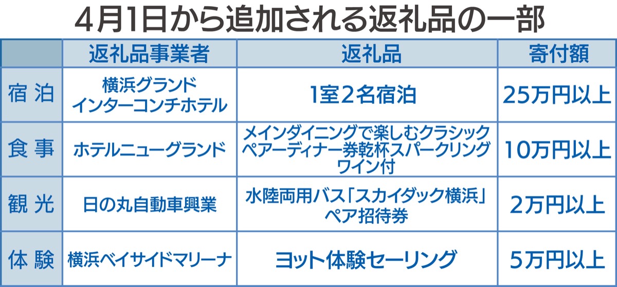 市担当者は「文化芸術、観光施策の推進から返礼品を追加した。ふるさと納税制度をきっかけに市外、県外の人に横浜に来て魅力を感じていただきたい」と話す。